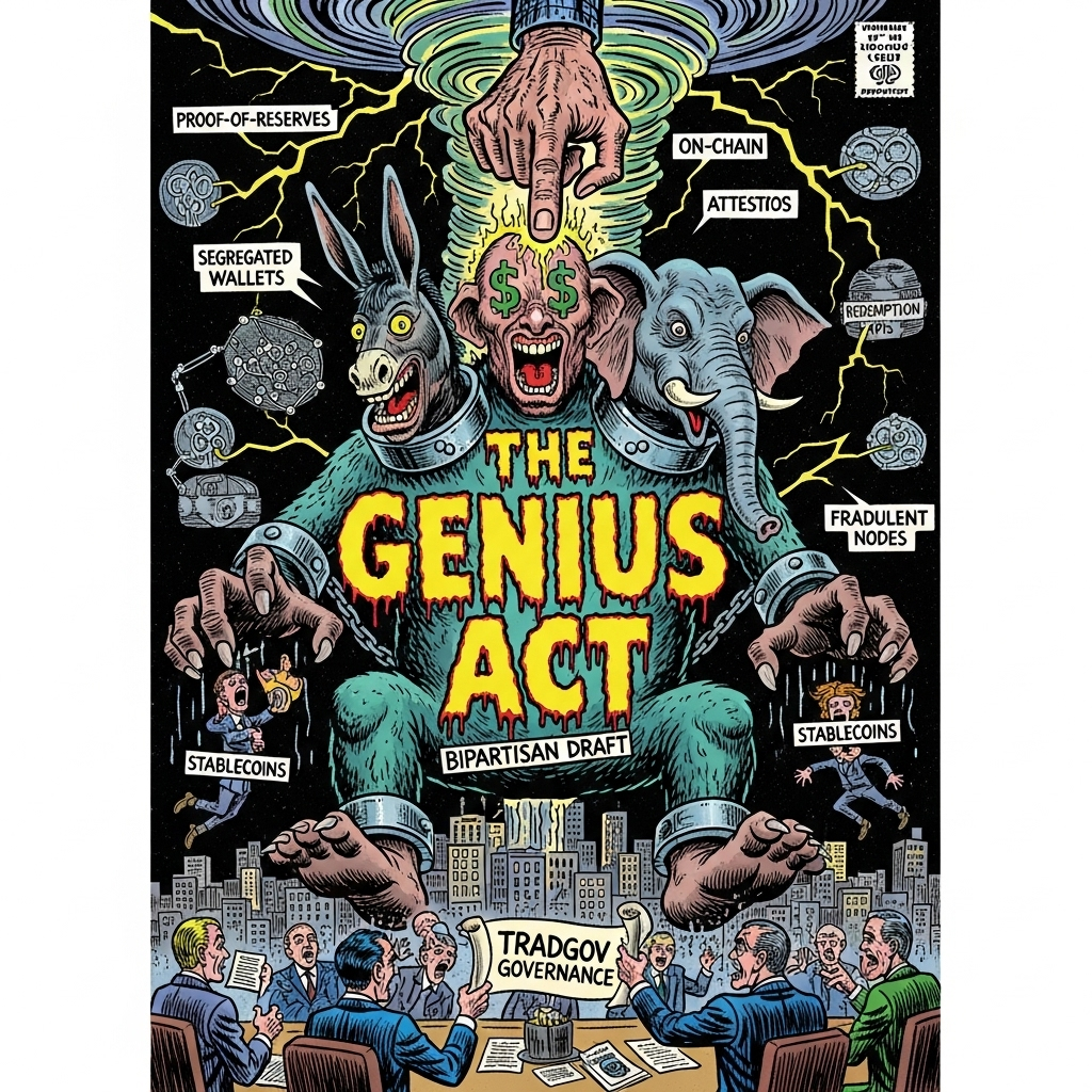 WASHINGTON — Block Timestamp 14,991,348 — A bipartisan draft, absurdly dubbed the “Genius Act,” is gaining momentum within the TradGov governance committee. Their aim is to put stablecoins—fiat-pegged tokens—on what they’re calling “simple, auditable rails.” The bill’s core idea isn’t some new political ideology; it’s a remedial attempt to understand basic network plumbing: requiring one-to-one proof-of-reserves, segregated wallets, regular on-chain attestations, fast redemption APIs, and immediate ejection for fraudulent nodes that rug-pull their users. They’ve finally realized you should treat payment tokens as a protocol for value transfer and let their ancient securities laws handle actual investment contracts. For normie users and merchants, the win is a better UX without the risk of getting liquidated.